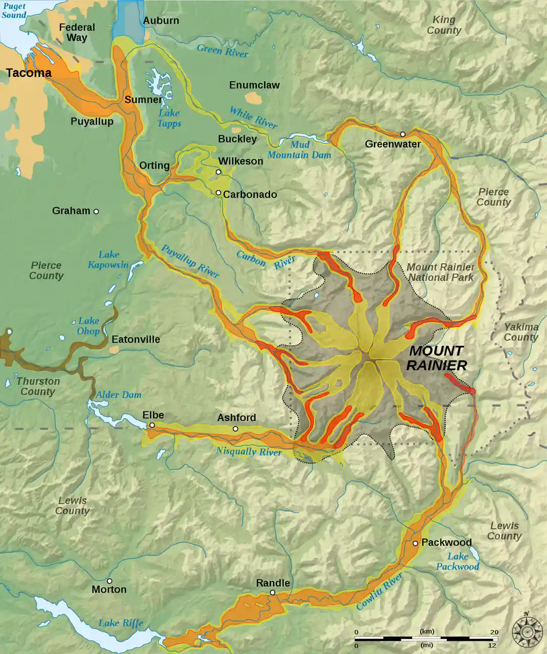 The Bridge for Kids is a proposed bridge across the Carbon River in Orting, Washington, about a mile upstream of where it joins the Puyallup River. It would provide an emergency evacuation route for school children to escape a future lahar flow from Mount Rainier, consisting of an up to high flood of mud, rock and boulders. , the $40 million bridge was still in the planning phase. Read more on Wikipedia