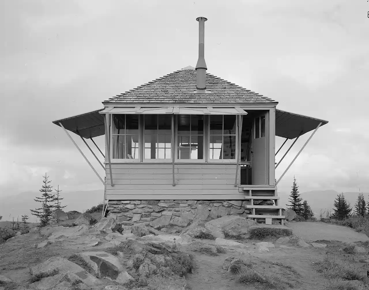 Suntop Lookout (also Sun Top) is located on Suntop Mountain in Mount Baker-Snoqualmie National Forest in central Washington, USA. The fire lookout is at an elevation of about overlooking the valleys of the White River and Huckleberry Creek just to the north of Mount Rainier National Park. Built to standard U.S. Forest Service plans, the one-story ground-level lookout measures fourteen by fourteen feet. The frame structure is capped by a pyramidal roof, and features large windows on all four sides with pivoting shutters that act as sunshades. Read more on Wikipedia