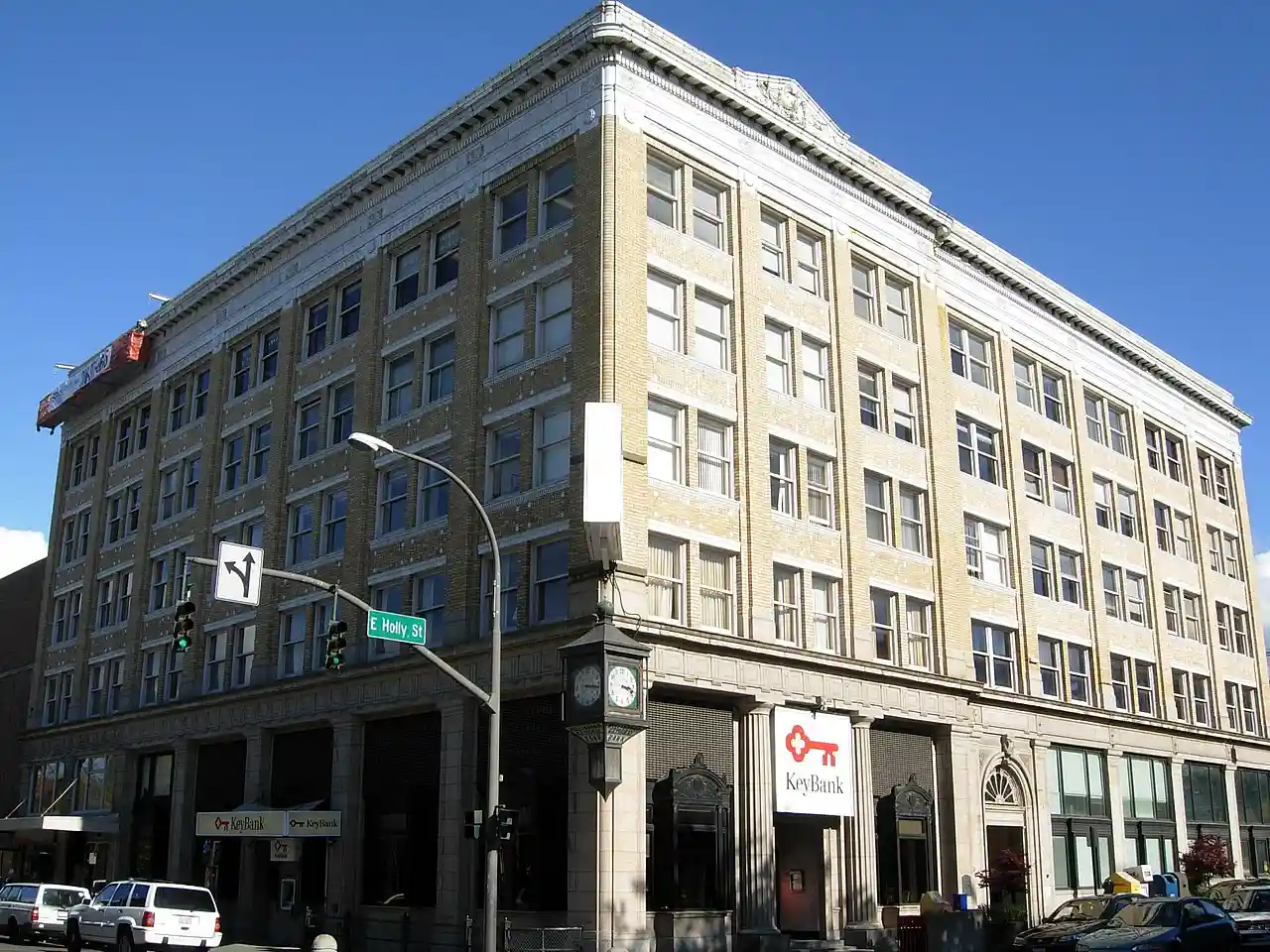 The Bellingham National Bank Building is an historic commercial/office building located in downtown Bellingham, Washington. It was originally built from 1912 to 1913 in a restrained Beaux Arts commercial style with reinforced concrete. Even though this particular style was common for cities in the midwest and east coast, the building style was a stark contrast for Bellingham's sandstone and rounded arch buildings. The Bellingham National Bank occupied the building starting on December 1, 1913.Bellingham National Bank Building (1912-1913) - City of Belligham, WA Read more on Wikipedia