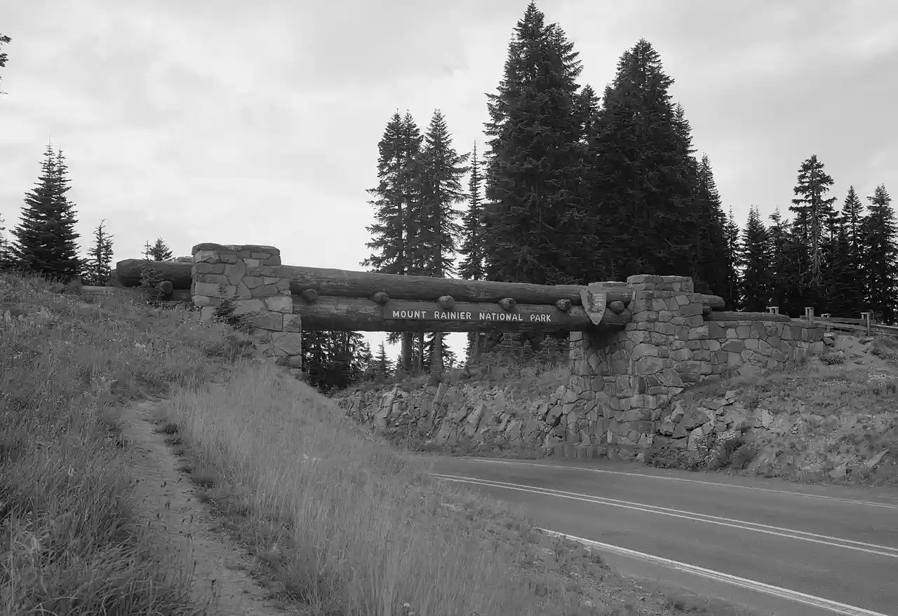 The Chinook Pass Entrance Arch marks the east entrance to Mount Rainier National Park. The rectangular log entry arch is one of several placed at the entrances to the park. It was designed in 1933 by the National Park Service Branch of Plans and Designs, and was built in 1936 by the Civilian Conservation Corps. The arch consists of two stone abutments carrying horizontal logs over the road. The arch functions as a bridge, carrying a horse trail, which is now part of the Pacific Crest Trail. Read more on Wikipedia