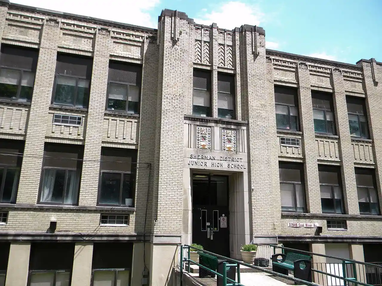 Whitesville School, also known as Sherman District Junior High School, Whitesville Junior High School, and Whitesville Elementary School, is a historic school building located at Whitesville, Boone County, West Virginia. It was built in 1931, and is a two-story, blonde brick Art Deco style building. It sits on a raised basement and has an original two-story gymnasium/auditorium addition in the rear. It features two entrance areas that extend from the main elevation and upward through the roofline in a "tower" formation. Read more on Wikipedia