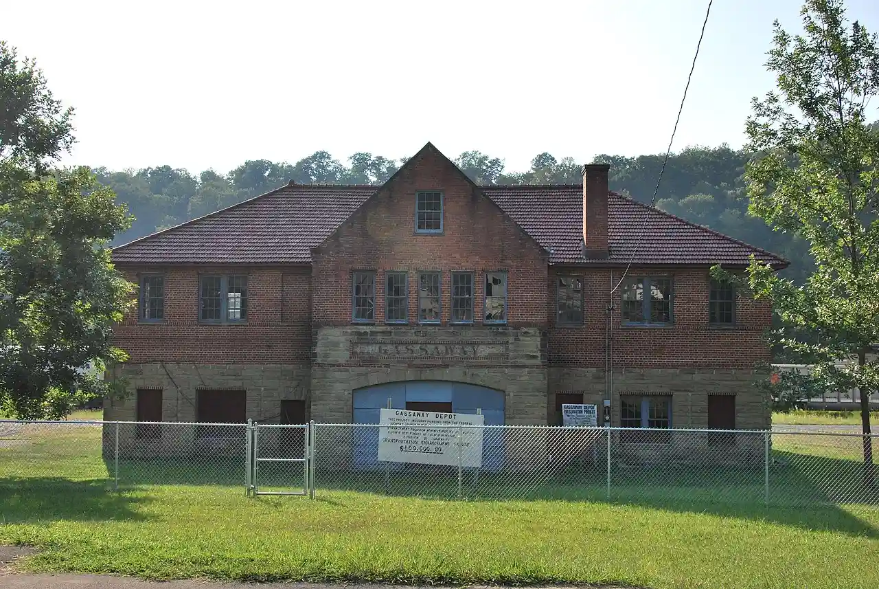 Gassaway station, also known as Coal & Coke Railway Company Depot, is a historic railway depot located at Gassaway, Braxton County, West Virginia. It was built in 1914, by the Coal and Coke Railway and later acquired by the Baltimore and Ohio Railroad. It is a two-story, brick and stone, Romanesque Revival-style building measuring 78 feet wide and 35 feet deep. It features two projecting pavilions, each 26 feet long and projecting 6 feet. It has a hipped roof with red ceramic "French tile." Passenger service ceased in 1953, and the depot continued use as a maintenance shop through 1988. Read more on Wikipedia