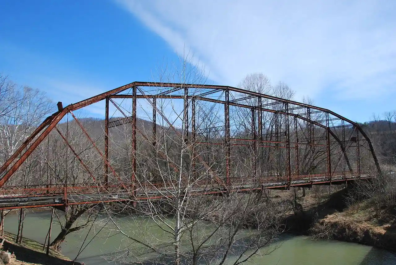 The Stouts Mill Bridge is a historic camelback through truss bridge that brings Duskcamp Rd. over Little Kanawha River in Stouts Mill, Gilmer County, West Virginia. The bridge was built in 1897. It was designed and/or built by the Canton Bridge Company. Read more on Wikipedia