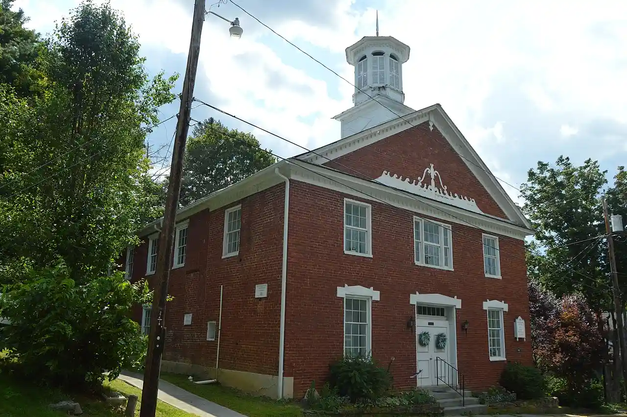 John Wesley Methodist Church, also known as First Methodist Church, is a historic Methodist church on E. Foster Street in Lewisburg, Greenbrier County, West Virginia. It was built in 1820, and is a two-story, brick meeting house building with Greek Revival style design elements. It originally measures 58 feet long by 47 feet wide. In 1835, a vestibule addition added 10 feet to the length. The interior features a "slave gallery." During the Battle of Lewisburg, a cannonball struck the southwest corner and the repairs remain visible. Read more on Wikipedia