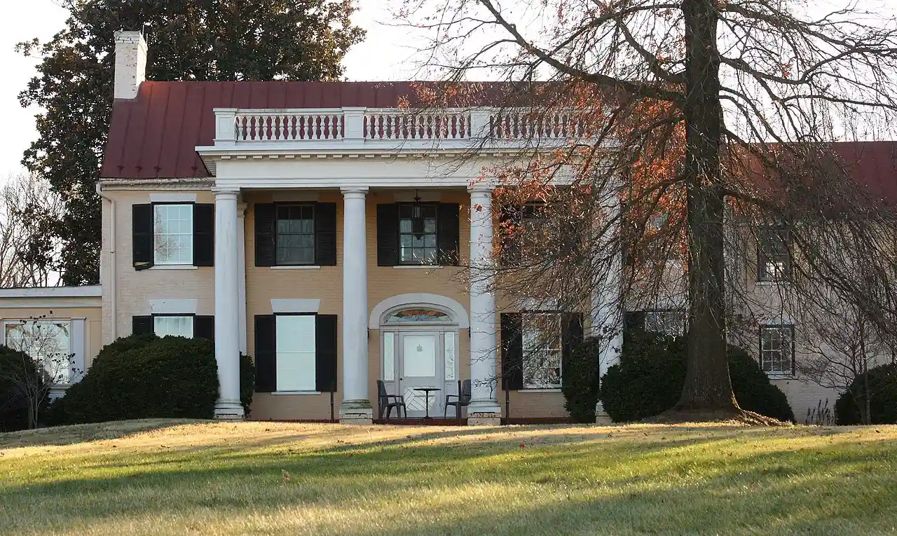 Blakeley, near Charles Town, West Virginia is also known as the Washington - Chew - Funkhouser House, and was built in 1820 by John Augustine Washington II, great-nephew of George Washington and grandson of John Augustine Washington. It is a contemporary of its neighbor, Claymont Court, built across Bullskin Run by John's brother, Bushrod Corbin Washington. John Washington did not attempt to match the grandeur of Claymont Court, as he was in line to inherit Mount Vernon, and did so in 1829. Read more on Wikipedia