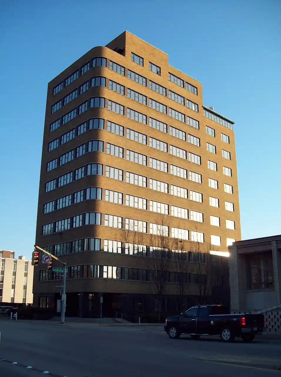 United Carbon Building, also known as Boulevard Tower, Stanley Building, and Nelson Building, is a historic office building located at Charleston, West Virginia. It is a 12-story, steel-framed building sheathed in a smooth, unornamented shell of gold-colored brick, black steel and glass. Its slender volume rises 157 feet from the sidewalk to the twelfth-floor penthouse, which once served as the office of the building's prominent patron, Oscar Nelson (1879-1953). Mr. Nelson, president Read more on Wikipedia