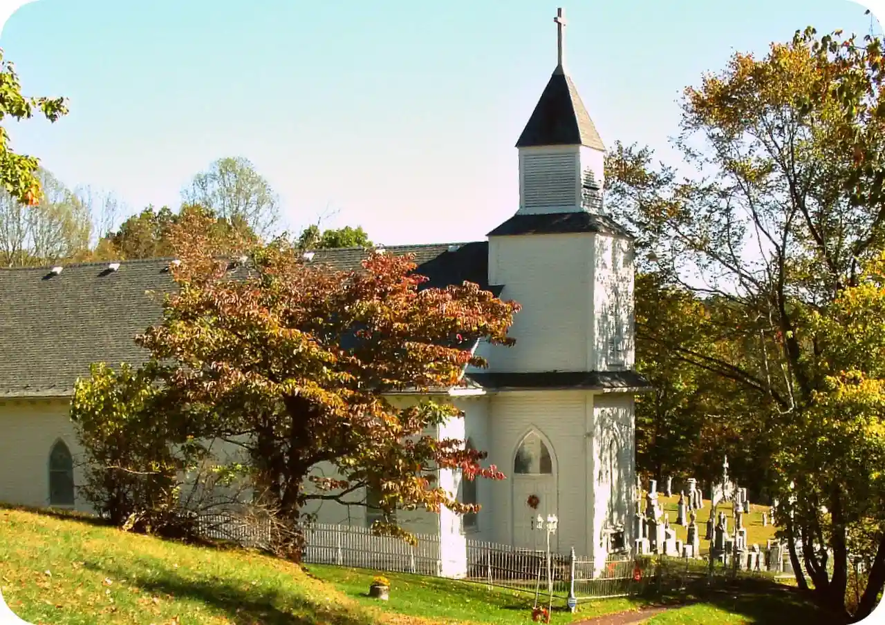 St. Bernard Church and Cemetery is a historic Roman Catholic church and cemetery near Camden, Lewis County, West Virginia. It was built in 1909, and is a rectangular gable-roofed, one-story frame structure in the Gothic Revival style. It features a two-story entrance bell tower. The property includes the church cemetery; it includes the grave of Father Thomas Aquinas Quirk (1845-1937). Most of the settlers in the region, including the congregants of the church, were of Irish descent. Read more on Wikipedia