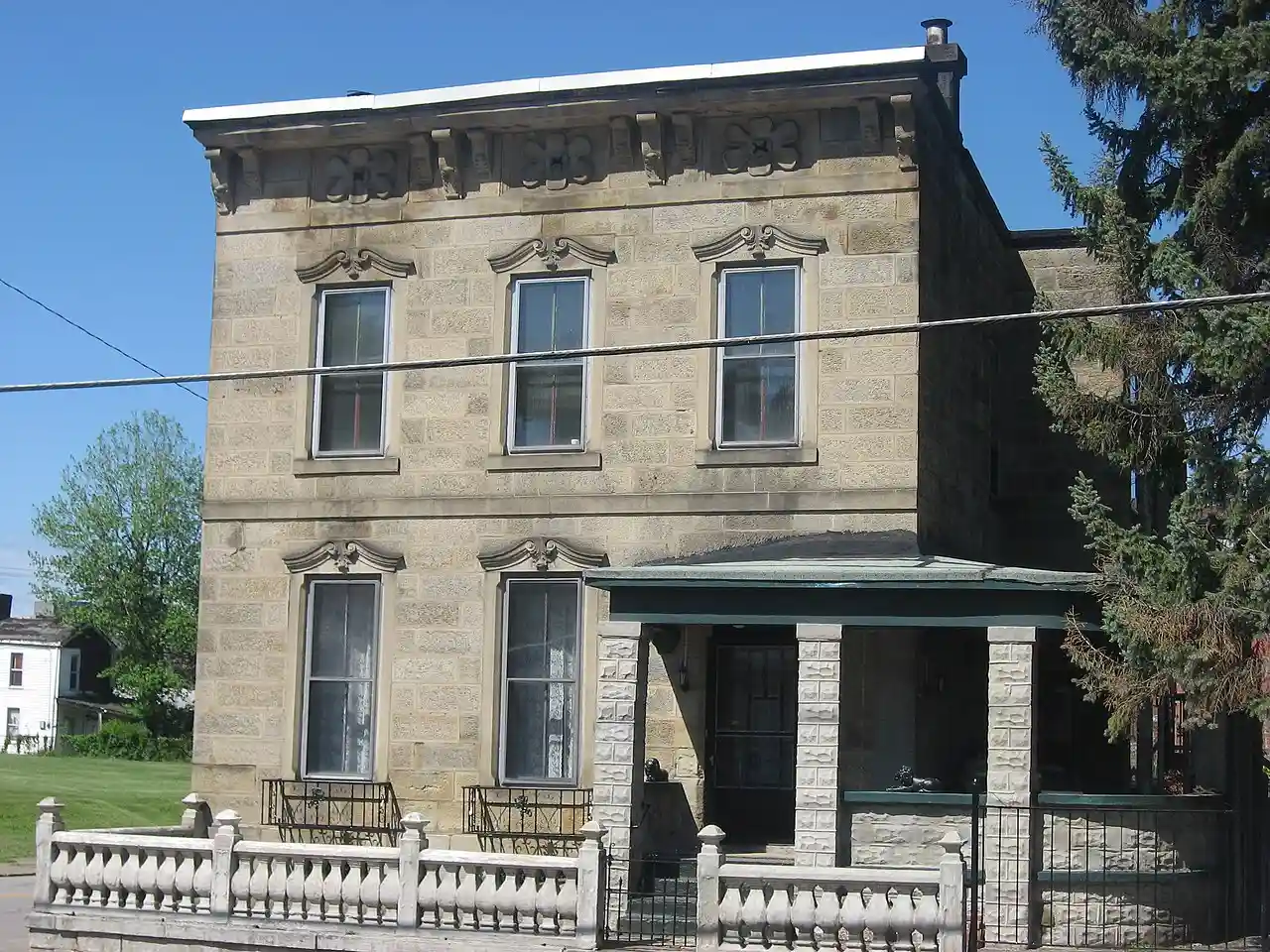 Lang-Hess House is a historic home located at Wheeling, Ohio County, West Virginia. It was built about 1865, and is a two-story sandstone building with Italianate design details. An attached ‘sun porch’ was added to the house about 1935. Its builder was associated with the architect and engineers of the Wheeling Suspension Bridge, and is believed to have used “extra” sandstone to build his residence following the work on bridge. Read more on Wikipedia