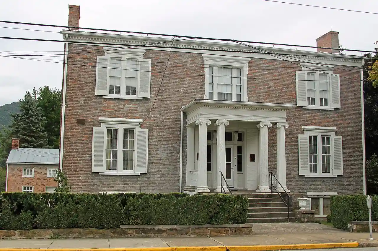 The McCoy House, also known as Franklin Town Office or Pendleton County Library, is a historic home located at Franklin, Pendleton County, West Virginia. It was built in 1848, and is a two- to three-story, L-shaped, brick building in the Greek Revival-style. It features a one-bay entrance portico with two sets of double Ionic order columns. A three-story porch is incorporated into the northeastern section. Read more on Wikipedia