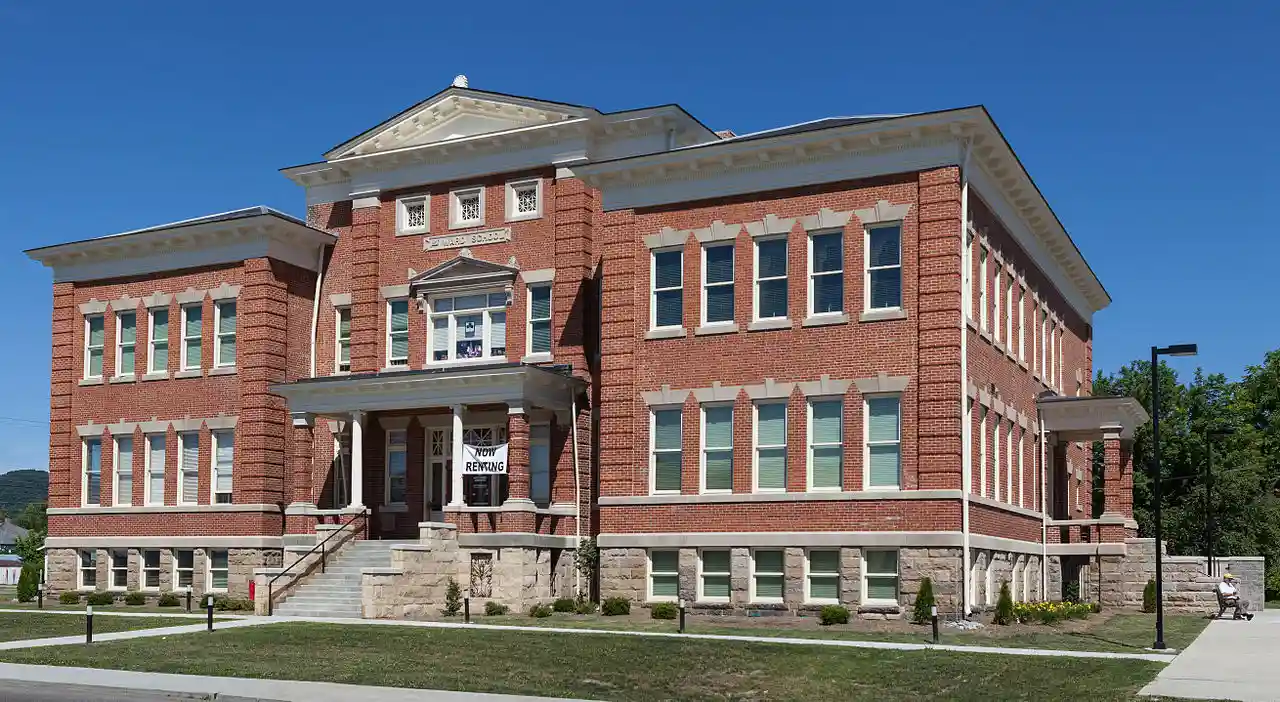 First Ward School is a historic school building located at Elkins, Randolph County, West Virginia. It was built in 1907, is a two-story brick masonry structure, with full basement and sandstone trim. It has a slate covered hipped roof and is in the Classical Revival style. The interior features hard maple flooring and quarter-sawn oak staircases, wainscotings, built-in bookcases, doors, moldings, and trim work. It was built as a combined elementary and high school. It served as an elementary school alone from 1926 to 1976, when the building was retired as a school. Read more on Wikipedia