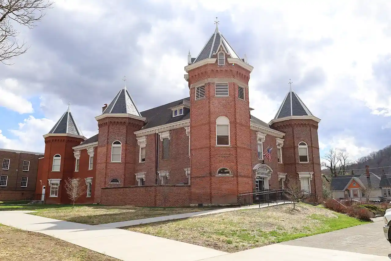 The Summers County Courthouse in Hinton, West Virginia, is a red brick Romanesque Revival or late Victorian building, originally constructed in 1875–76. The building was remodeled between 1893 and 1898 by architect Frank Pierce Milburn, who added octagonal turrets at the corners. A 1923 addition followed suit with another square with two towers. A plan 1930s addition followed. A cast-iron stairway in the northwest tower ascends to the courtroom. Read more on Wikipedia