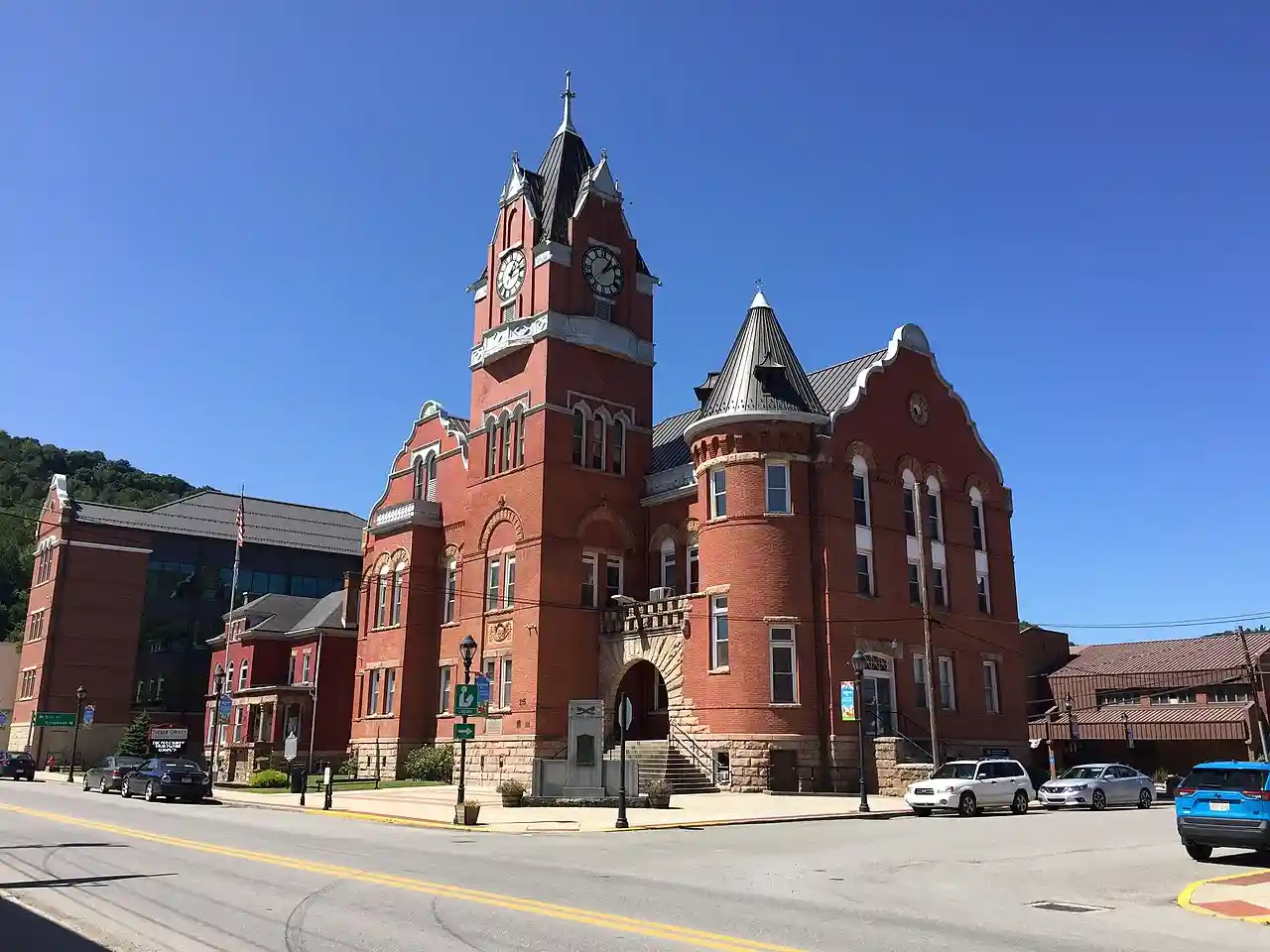 The Tucker County Courthouse and Jail in Parsons, West Virginia was built between 1898 and 1900 in a combination of Flemish Renaissance and Romanesque Revival styles. The red pressed-brick structure is flanked by a "jail and jailer's residence" built in 1896 in a similar style. Read more on Wikipedia
