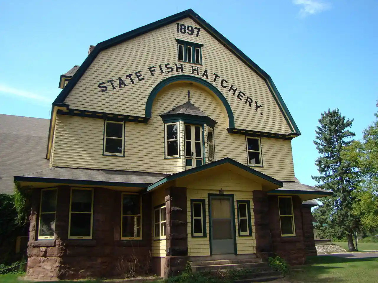 The Bayfield Fish Hatchery is a historic fish hatchery in Salmo, Wisconsin, located southwest of Bayfield. The hatchery was built in 1897 in the Queen Anne style and Shingle style using local brownstone and played a historically significant role in the fishing industry on Lake Superior. On July 22, 1981, the hatchery was listed on the National Register of Historic Places. Read more on Wikipedia