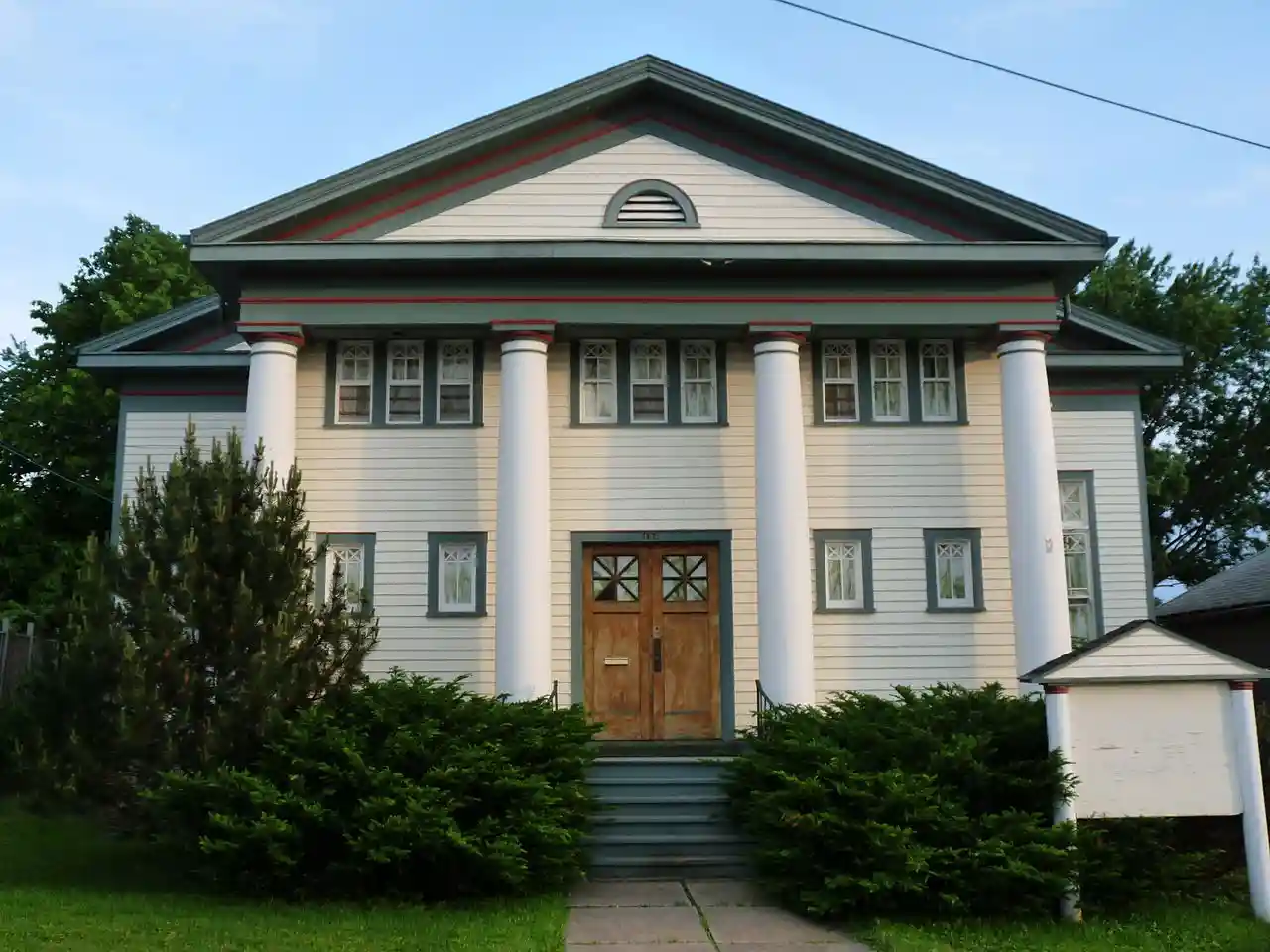 The former First Church of Christ, Scientist, built in 1916 in the Classical Revival style, is a historic Christian Science church edifice located at 132 E. 4th Street in Neillsville, Wisconsin. It was designed in the form of a Greek cross by Chicago architect L. J. Corbey for Christian Science Society, Neillsville, which had been organized in January, 1912 and which later became First Church of Christ, Scientist. Its front portico is supported by four large Tuscan columns. While small in size, the building projects a large presence. Its auditorium windows are of green opalescent art glass. On March 31, 2003, it was added to the National Register of Historic Places. Read more on Wikipedia