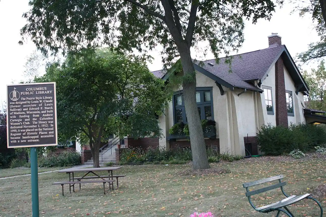 The Columbus Public Library is a Carnegie library in Columbus, Wisconsin. The library was built in 1912 after the Columbus Women's Civic Club convinced the Carnegie Foundation to sponsor a building for the community's library program. Claude and Starck, a Madison architectural firm known for designing libraries, planned the Prairie School building. The library is still in operation; in addition to library services, the building also held Women's Civic Club meetings and various other community meetings. On November 15, 1990, the library was added to the National Register of Historic Places. Read more on Wikipedia