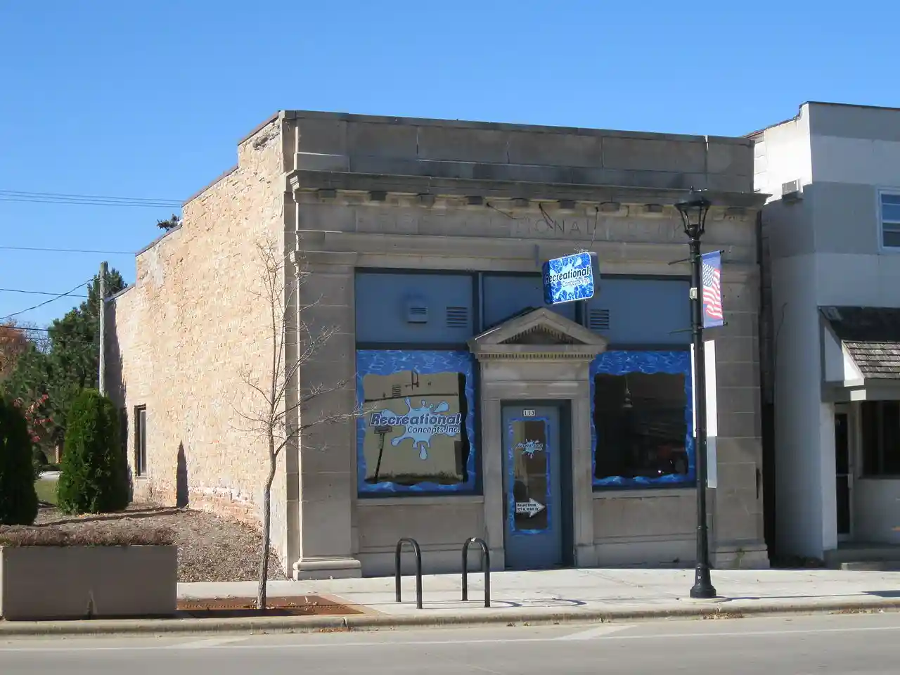 The First National Bank in Oregon, Wisconsin is a small Neoclassical-styled bank built in 1914. Read more on Wikipedia