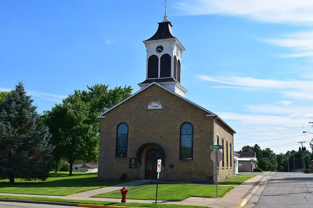 The Linden Methodist Church is a historic church building at the corner of Main and Church Streets in Linden, Wisconsin. Linden's Methodist congregation formed in 1834, only a few years after Linden was established as a mining community. It built a wooden church in 1836 and replaced it with a rock building in 1840, but by 1851 it had outgrown its second building as well. The 1851 church building is a limestone structure measuring ; like most contemporary churches in the area, the limestone was quarried locally by Cornish American masons. The church includes an arched entrance and stained glass windows on each side. The congregation placed a Victorian-style steeple atop the church in 1877-78. Read more on Wikipedia