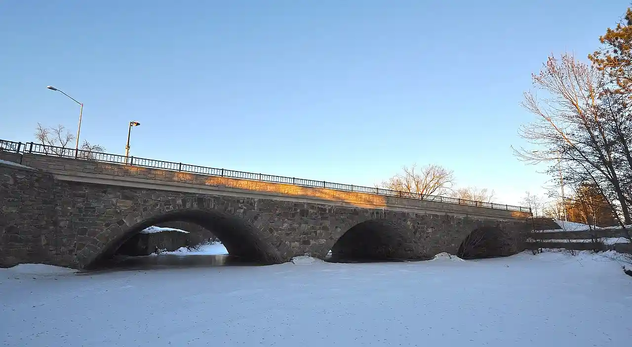 The First Street Bridge is a stone arch bridge in Merrill, Wisconsin, which carries First Street across the Prairie River. The bridge is long and has three arches. Each arch is bordered by an alternating pattern of single and double stones and is capped by keystones. Contractor Fred Hesterman built the bridge in 1904, replacing an existing bridge. The bridge is the only known three stone arch bridge in Wisconsin. Read more on Wikipedia