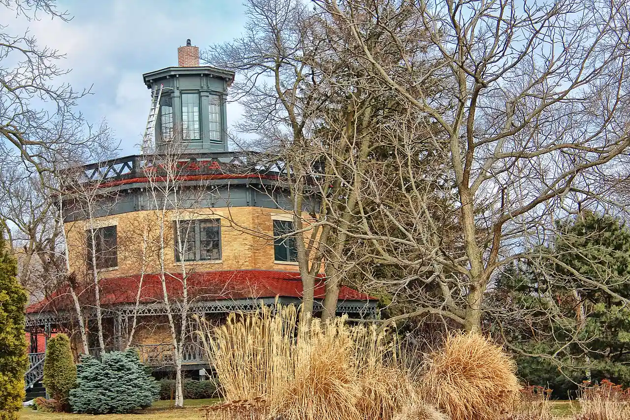 The Edward Elderkin House, also known as the Round House, is a historic octagon house built in 1856 by Edward Elderkin. It is located at 127 South Lincoln Street in Elkhorn, Wisconsin, United States. On May 3, 1974, it was added to the National Register of Historic Places. The two-story home was constructed of buff brick and features a wrap-around porch, a tall, windowed cupola and a central chimney. Read more on Wikipedia