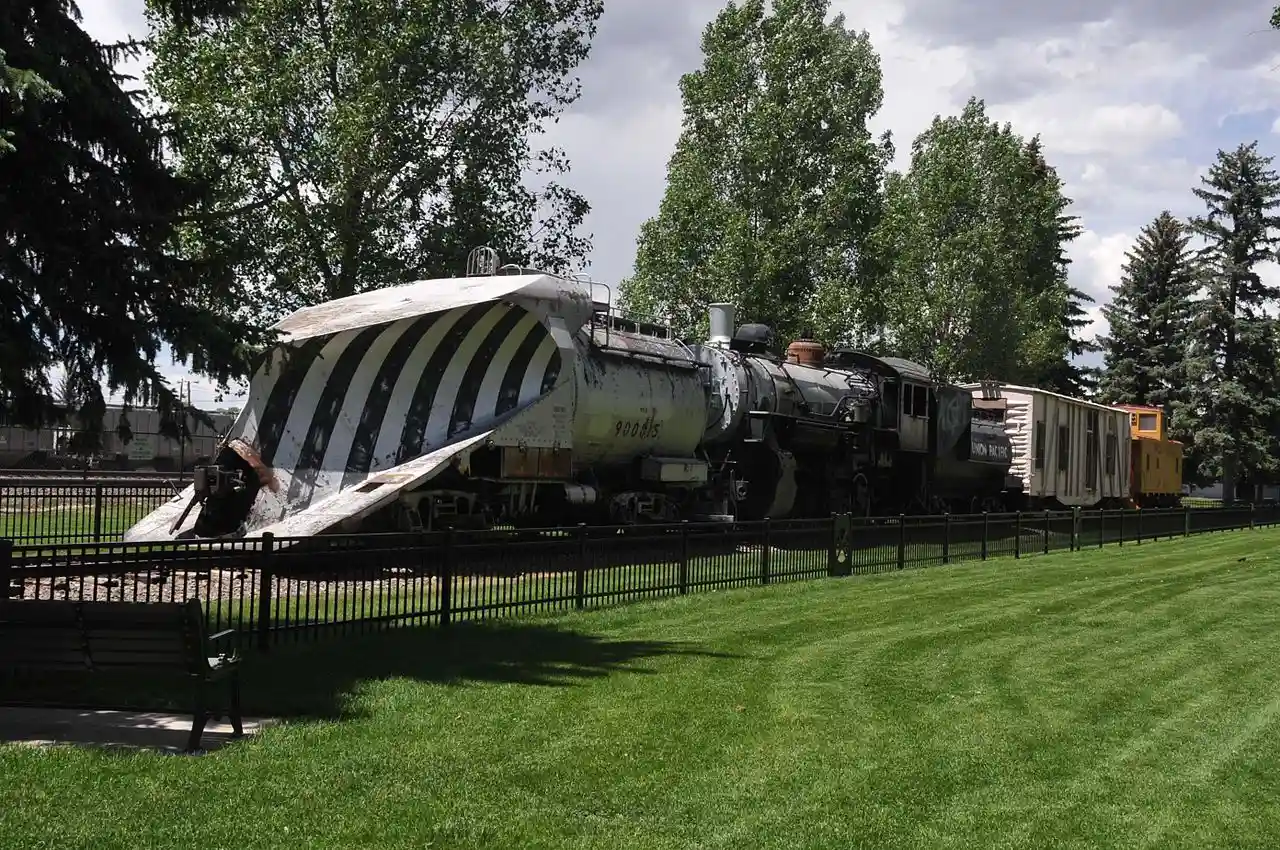 The Snow Train Rolling Stock, located in Railroad Heritage Park in Laramie, Wyoming, consists of five pieces of Union Pacific Railroad rolling stock. The five vehicles, which are a snow plow, locomotive, tender, bunk car, and caboose, form a snow train, a type of train used to clear snow from rail lines. The snow plow was built as a tender and converted to a wedge-shaped plow in 1953. The locomotive was built in 1903 and served in Wyoming from 1947 to 1957; it served as part of snow trains in 1949 during a blizzard. The bunk car was originally built as an automobile car in 1929 and became a bunk car in 1955; after its retirement, it served as a ticket office for the Wyoming Colorado Railroad. The tender was built between 1907 and 1920, and the caboose was built in 1955. Read more on Wikipedia