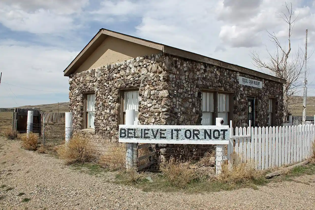 The Fossil Cabin near Medicine Bow, Wyoming, United States, was built in 1932 as a roadside attraction. The cabin is built of dinosaur bones excavated at nearby Como Bluff, using a total of 5,796 bones. The cabin was built as part of a gasoline filling station along US 30 by Thomas Boylan. Boylan had come from California to homestead in Wyoming and had been collecting bones for seventeen years, intending to create sculptures of dinosaurs in front of his house and gas station along the Lincoln Highway. Read more on Wikipedia
