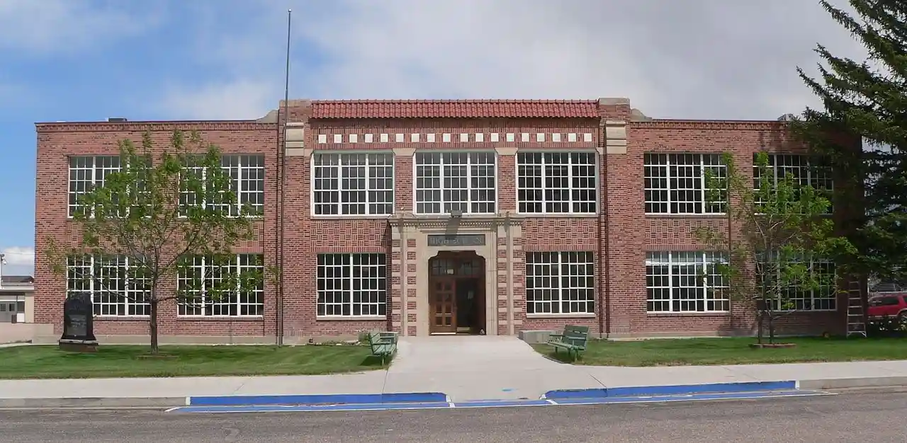 The Pine Bluffs High School, at the junction of 7th and Elm Sts. in Pine Bluffs, Wyoming, was built in 1929. It was listed on the National Register of Historic Places in 1996. Read more on Wikipedia