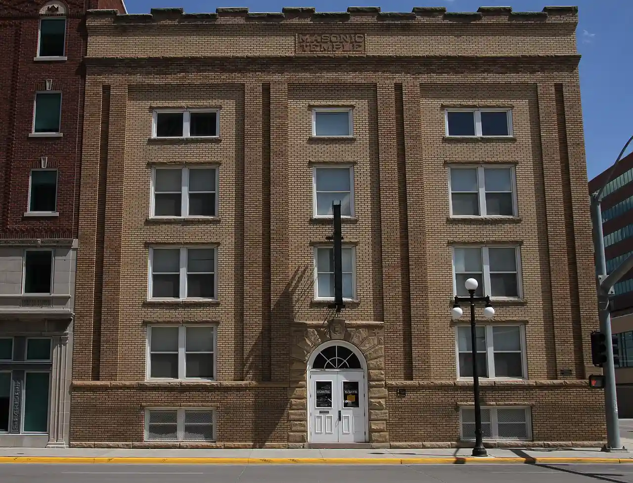 The Masonic Temple in downtown Casper, Wyoming is a Masonic hall, built in 1914 during a boom time initiated by the development of the Salt Creek Oil Field. Located on a corner site, the temple remains essentially as it was designed by Casper architect Homer F. Shaffer. The four story light-colored brick building rests on a raised basement and is topped by a crenelated parapet. The original windows have been replaced with vinyl units but retain the one-over-one appearance of the originals. Windows extend over the west and south sides. The north side is blank, while the east side is the building's rear facade and has fire escapes and a few windows. Read more on Wikipedia