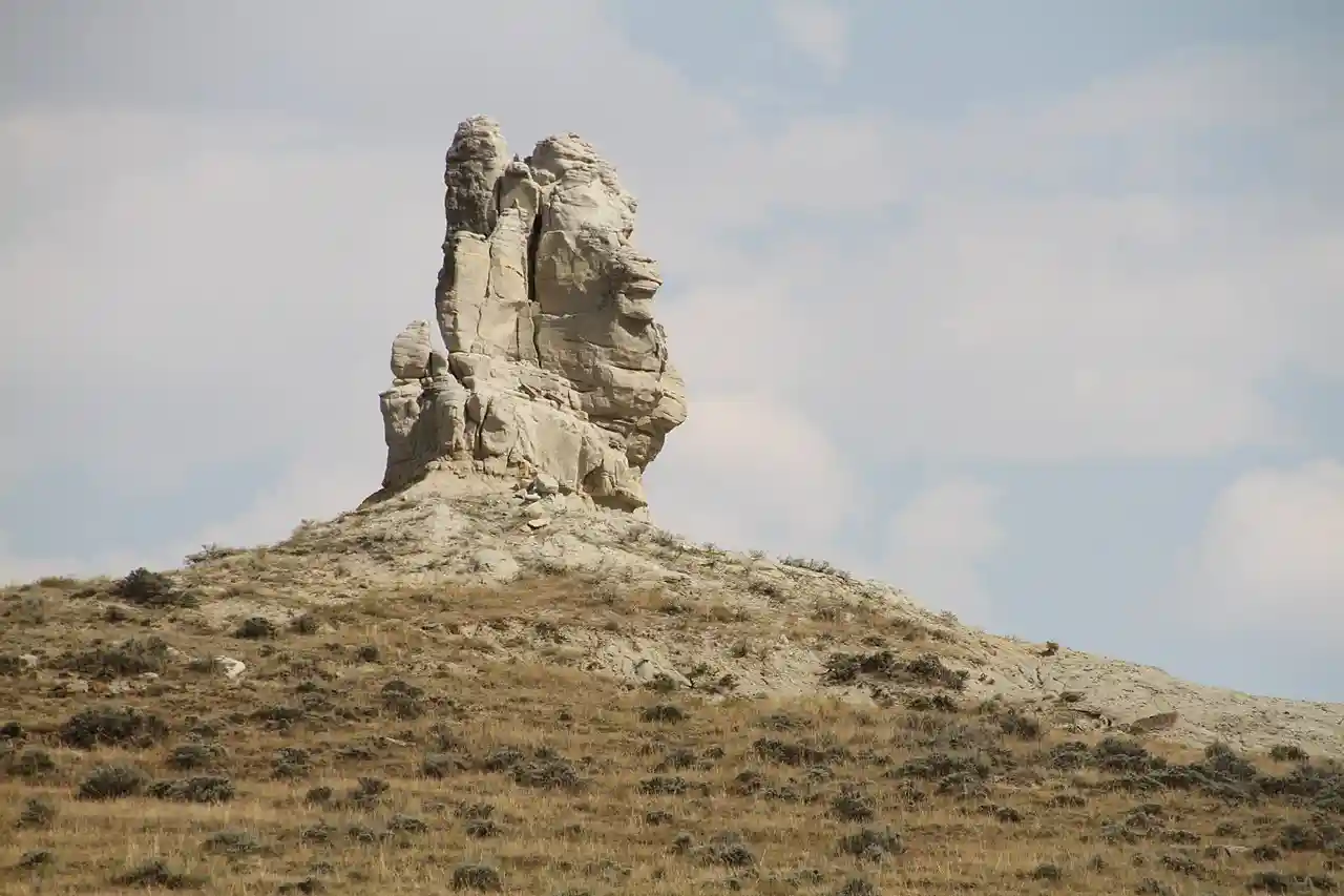 Teapot Rock, also Teapot Dome, is a distinctive sedimentary rock formation and nearby oil field in Natrona County, Wyoming that became the focus of the Teapot Dome bribery scandal during the administration of President Warren G. Harding. The site was listed on the National Register of Historic Places in 1974. Read more on Wikipedia