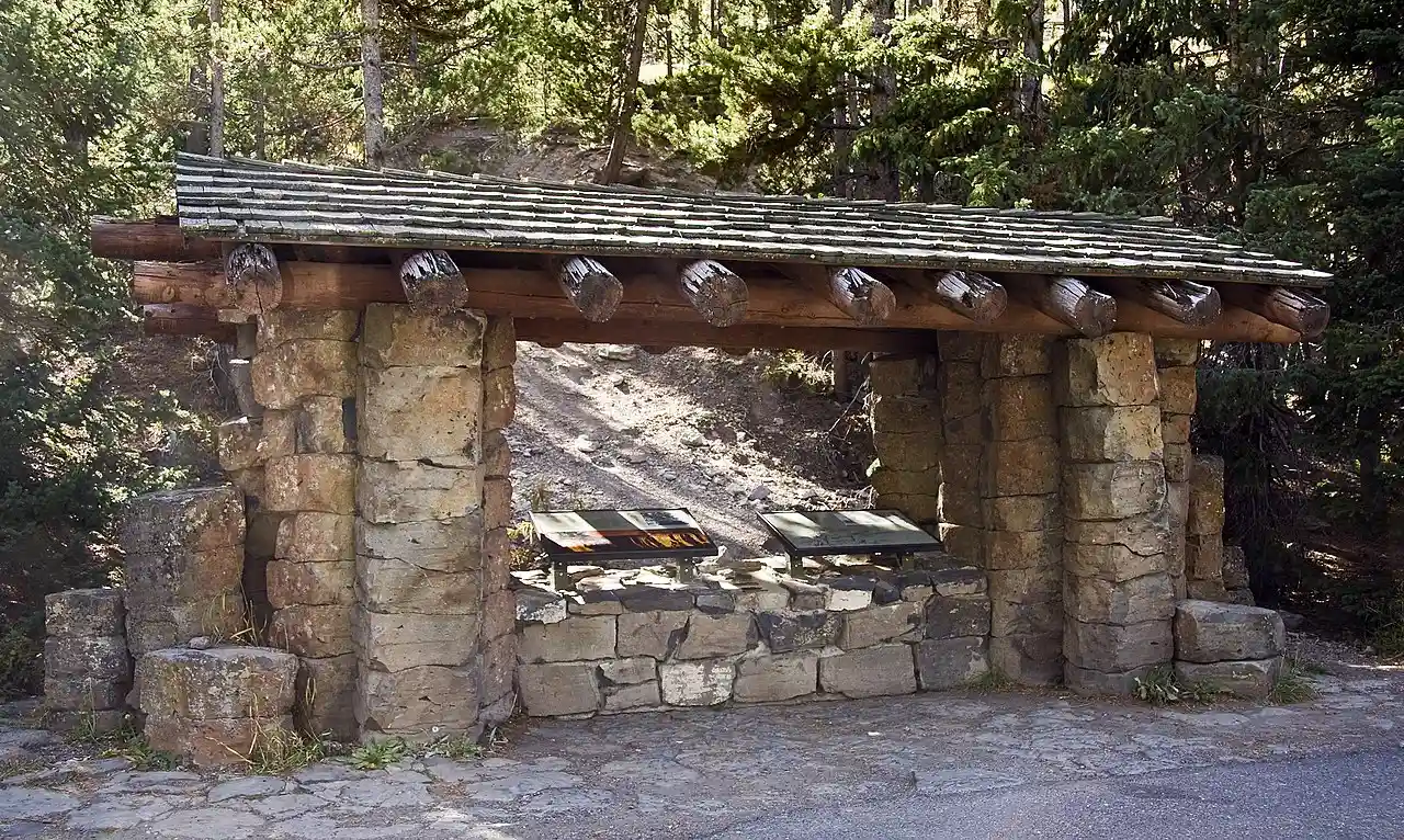 The Obsidian Cliff Kiosk is a small structure that shelters an interpretive exhibit in Yellowstone National Park at Obsidian Cliff. The kiosk was built in 1931 as part of an effort to provide interpretive exhibits along the park's Grand Loop Road. In common with the Fishing Bridge Museum, Madison Museum and Norris Museum, the kiosk exemplifies the National Park Service Rustic style. The interpretive exhibit was designed by National Park Service's Carl Russell, who provided many other innovations in visitor experiences. Read more on Wikipedia