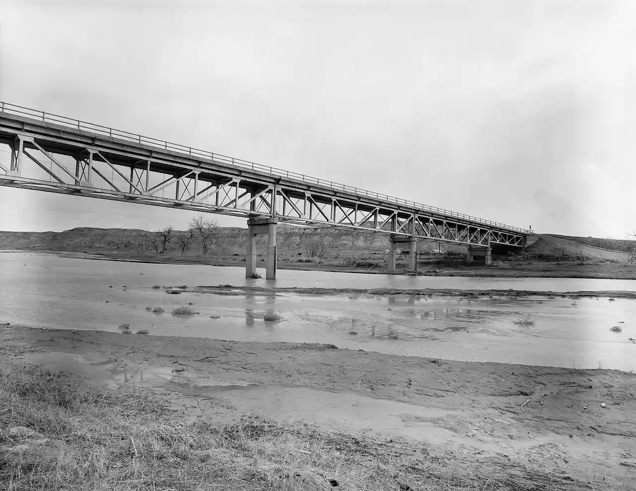 The CKW Bridge over Powder River is a Pratt deck truss bridge near Arvada, Wyoming, which carries US 14/US 16 across the Powder River. The bridge was built from 1932 to 1933 by the W. P. Roscoe Company. The bridge has three continuous main spans and two shallow approach spans. It is the only continuous truss bridge still in use on a Wyoming road and one of only two deck truss bridges built on a major highway. Read more on Wikipedia