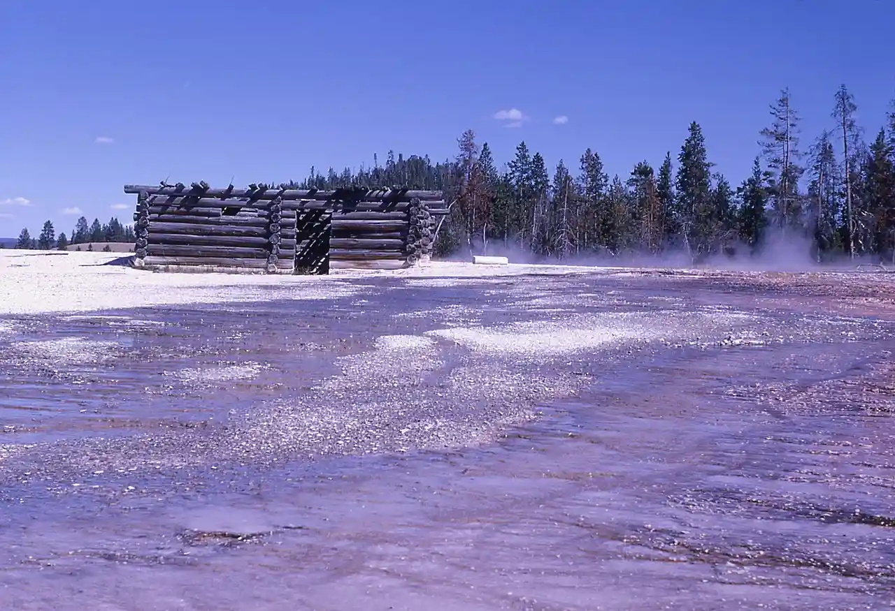 The Queen's Laundry Bath House is a ruinous structure in Yellowstone National Park. The log building sits on the edge of the Queen's Laundry thermal feature in the Lower Geyser Basin. The water at this location is somewhat cooler than the norm, allowing early tourists to bathe. Begun by Yellowstone park superintendent Philetus Norris, the bath house was intended to have two rooms and a dirt-covered roof, but was never completed. Begun in 1881, it may be the oldest extant park visitor structure in the National Park Service system. Read more on Wikipedia