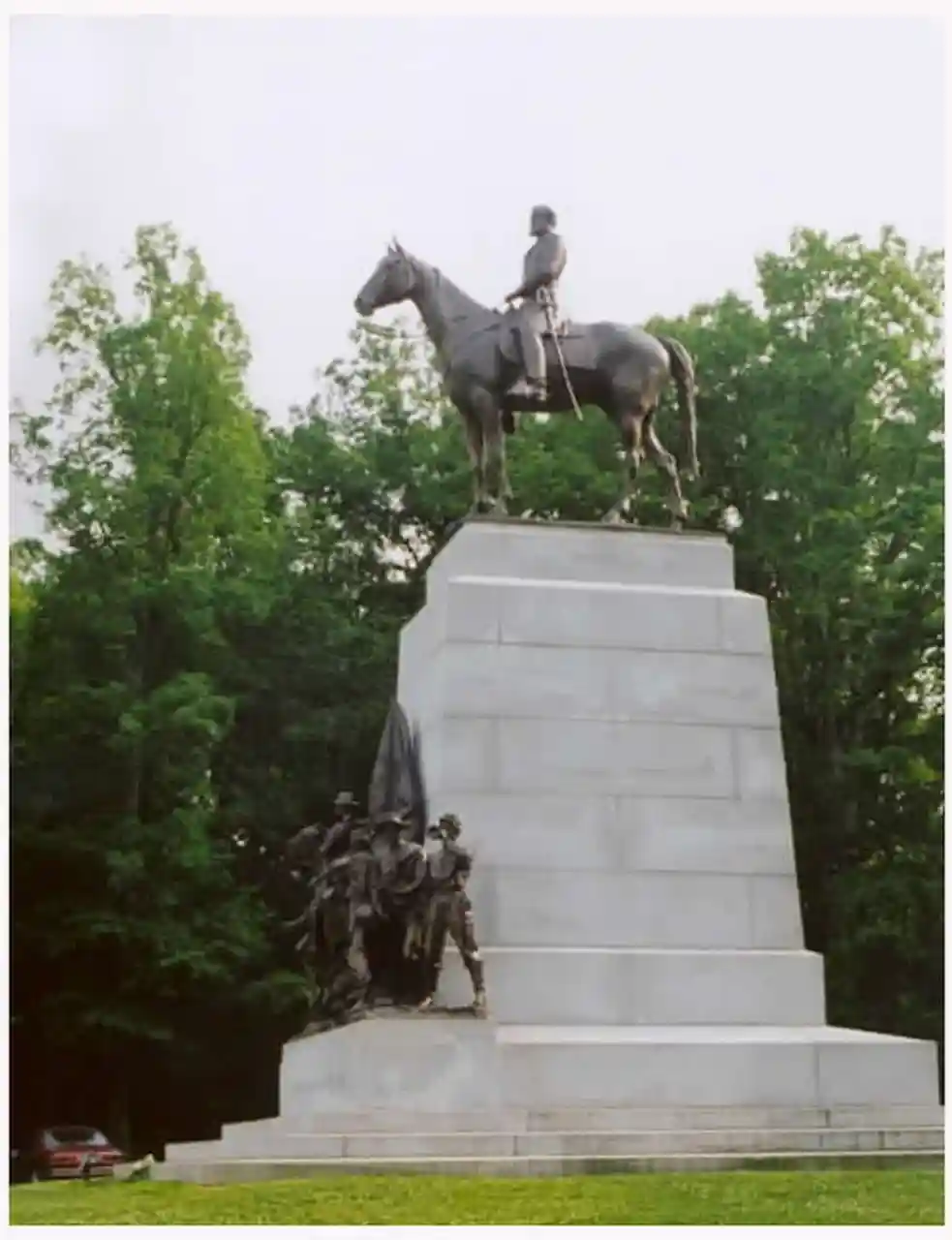 The Virginia Monument, also commonly referred to as "The State of Virginia Monument", is a Battle of Gettysburg memorial to the commonwealth's "Sons at Gettysburg" with a bronze statue of Robert E. Lee on his horse Traveller and a "bronze group of figures representing the Artillery, Infantry, and Cavalry of the Confederate Army". The equestrian statue is atop a granite pedestal and the group of six standing figures is on a sculpted bronze base with the figures facing the Field of Pickett's Charge and the equestrian statue of Union General George G. Meade on Cemetery Ridge. The granite pedestal without either sculpture was dedicated on June 30, 1913 for the 1913 Gettysburg reunion. On June 8, 1917, Virginia governor Henry C. Stuart presented the completed memorial to the public. Read more on Wikipedia