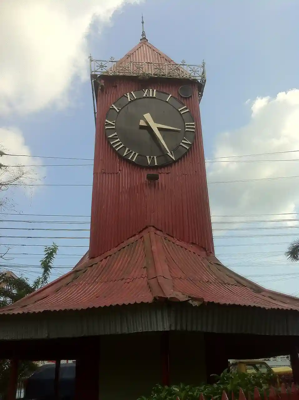 Ali Amjad's Clock (, ) is the oldest clock tower of Bangladesh and lies on the north bank of the Surma River in the northeastern city of Sylhet. The tower was founded by Nawab Ali Ahmad Khan of Prithimpassa in 1872 and named after his son, Nawab Ali Amjad Khan. It is a popular tourist attraction adjacent to the Keane Bridge and is often used in the establishing shot of films set in Sylhet. Read more on Wikipedia