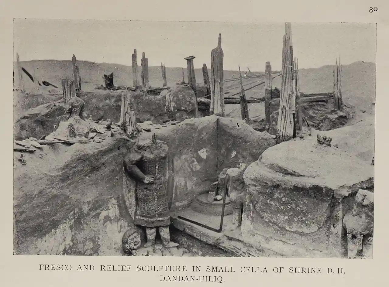 Dandan Oilik (), also Dandān-Uiliq, lit. "the houses with ivory", is an abandoned historic oasis town and Buddhist site in the Taklamakan Desert of China, located to the northeast of Khotan in what is now the autonomous region of Xinjiang, between the Khotan and Keriya rivers.(The map on this page gives the location of Dandan Oilik.) The central site covers an area of 4.5 km2; the greater oasis extends over an area of 22 km2. The site flourished from the sixth century as a site along the southern branch of the Silk Road Read more on Wikipedia