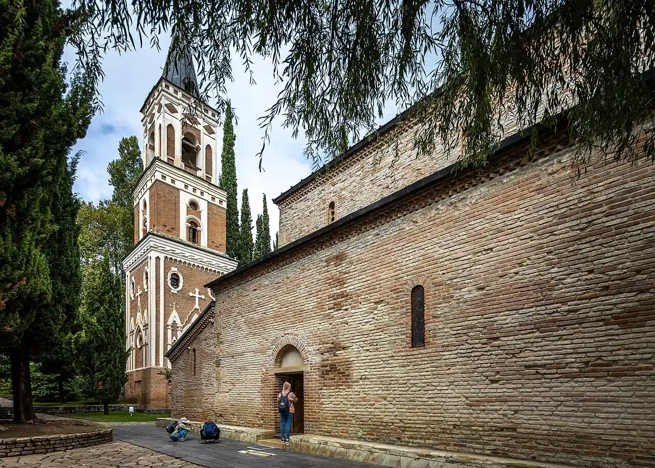 The Monastery of St. Nino at Bodbe (, bodbis ts’minda Ninos monasteri) is a Georgian Orthodox monastic complex and the seat of the Bishops of Bodbe located 2 km from the town of Sighnaghi, Kakheti, Georgia. Originally built in the 9th century, it has been significantly remodeled, especially in the 17th century. The monastery now functions as a nunnery and is one of the major pilgrimage sites in Georgia, due to its association with St. Nino, the 4th-century female evangelist of Georgians, whose relics are shrined there. Read more on Wikipedia