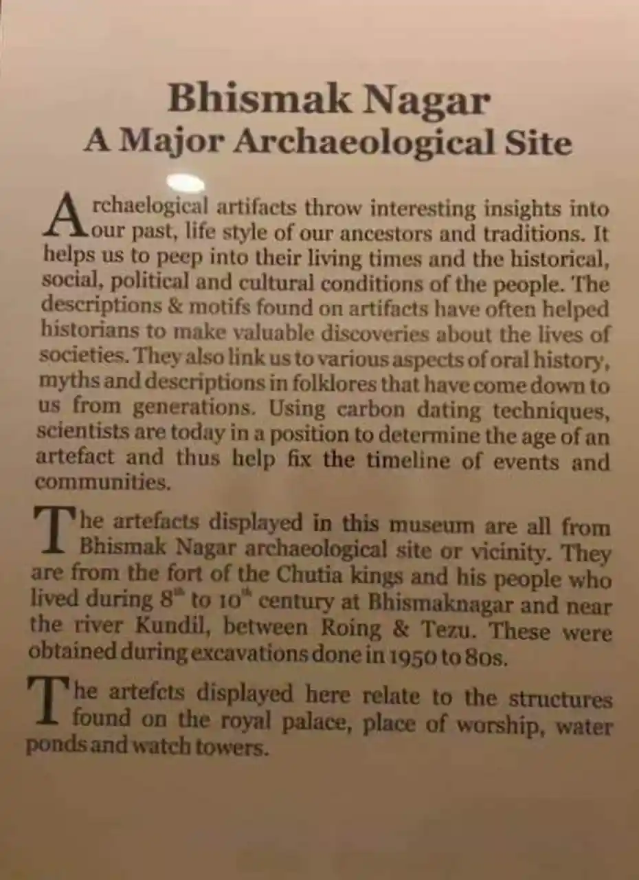 Bhismaknagar is an archeological site in Indian state of Arunachal Pradesh. It is located near Roing in Lower Dibang Valley district. The remains are generally ascribed to the rule of the Sutiyas, a Bodo-Kachari (Tibeto-Burmese) ethnic groupThe Sutiyas belong to the Bodos, a linguistic group of the Brahmaputra valley, speaking a Tibeto-Burman language and having different cognate groups within them. who ruled over the region of Sadiya from 11th to 16th Century CE.http://asiguwahaticircle.gov.in/bhismaknagar.html Remains at Bhismaknagar (ASI official website), "The remains are generally ascribed to he rule of the 'Chutias', a Tibeto-Burmese tribe who ruled over the region of Sadiya from 11th to 16th Century CE." Read more on Wikipedia