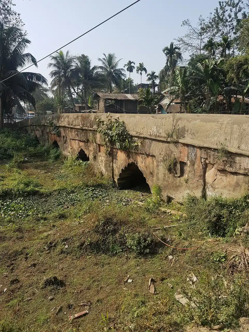 The Namdang Stone Bridge is a historic bridge located a few kilometers away from Sibsagar town in Assam, India. It was constructed in 1703 by craftmen brought from Bengal during the reign of Ahom king Rudra Singha. The bridge is long, wide and high. It runs over the Namdang (Tai-Ahom : Nam= Water; Dang=Red) river, a tributary of the Dikhou river. The present National Highway 37 is passing over it. The unique characteristic of the bridge is that it was cut out from a single solid piece of rock hundred years of age. Read more on Wikipedia