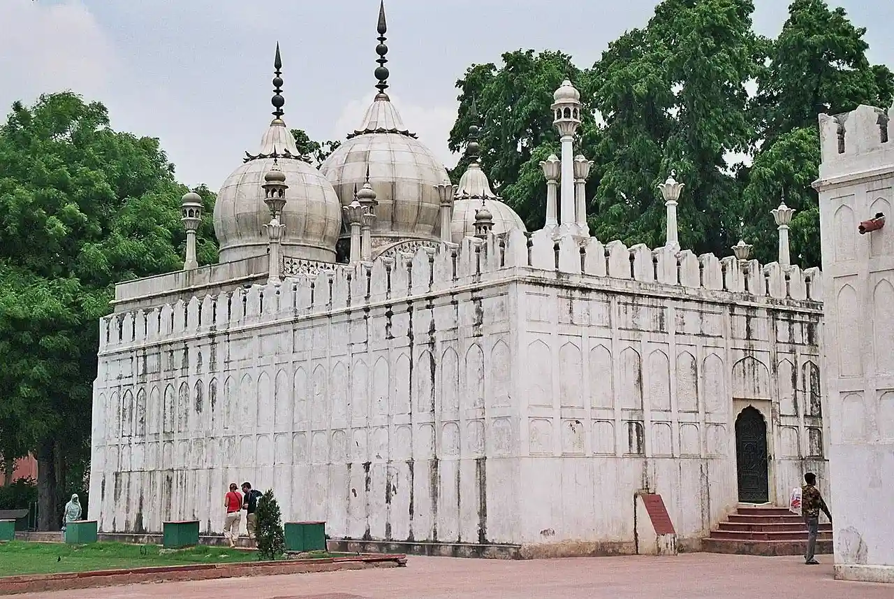The Moti Masjid () is a 17th-century mosque inside the Red Fort complex in Delhi, India. It was built by Mughal emperor Aurangzeb, damaged by the Siege of Delhi, and subsequently restored by the British. Named for its white marble, the mosque features ornate floral carvings. It is an important example of Mughal architecture during Aurangzeb's reign. Read more on Wikipedia