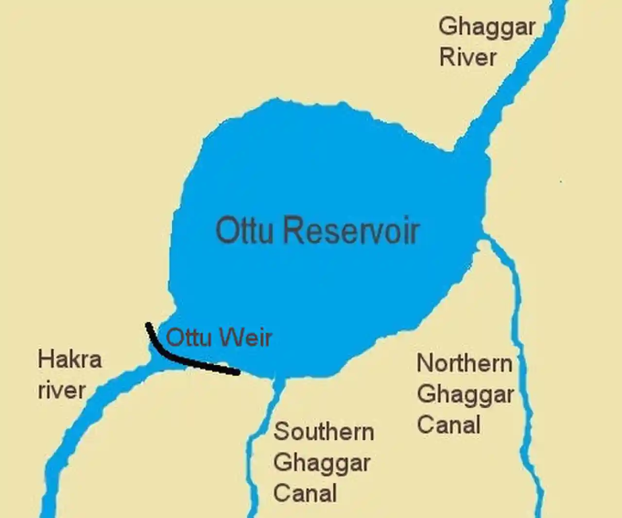The Ottu barrage, sometimes spelled as the Otu barrage and also known as Ottu Head, is a masonry weir on the Ghaggar-Hakra River in Sirsa, Haryana state of India that creates a large water reservoir out of the formerly-small Dhanur lake, located near the village of Ottu, which is about 8 miles from Sirsa City in Haryana, India. It is a feeder for the two Ghaggar canals (the Northern Ghaggar canal and the Southern Ghaggar canal) that carry irrigation water to northern Haryana state. In 2002, a new tourist complex was inaugurated at the barrage, and it was given the honorary name of "Chaudhary Devi Lal Weir" to commemorate the former Chief Minister of Haryana state, Chaudhary Devi Lal. The Dhanur lake reservoir is now often referred to simply as the Ottu reservoir. Read more on Wikipedia