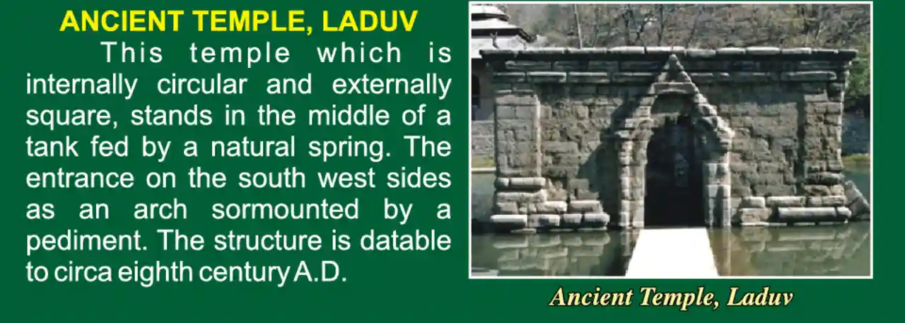 Ancient Temple, Ladhoo, is located in the middle of a natural fed pond or spring known as Sanz Haer Nag or Sanyasar Nag in Ladhoo, a village in the Pulwama district of the southern part of the Kashmir Valley of the Indian union territory of Jammu and Kashmir. It is away from NH44 via Lethapora and from Srinagar. Read more on Wikipedia