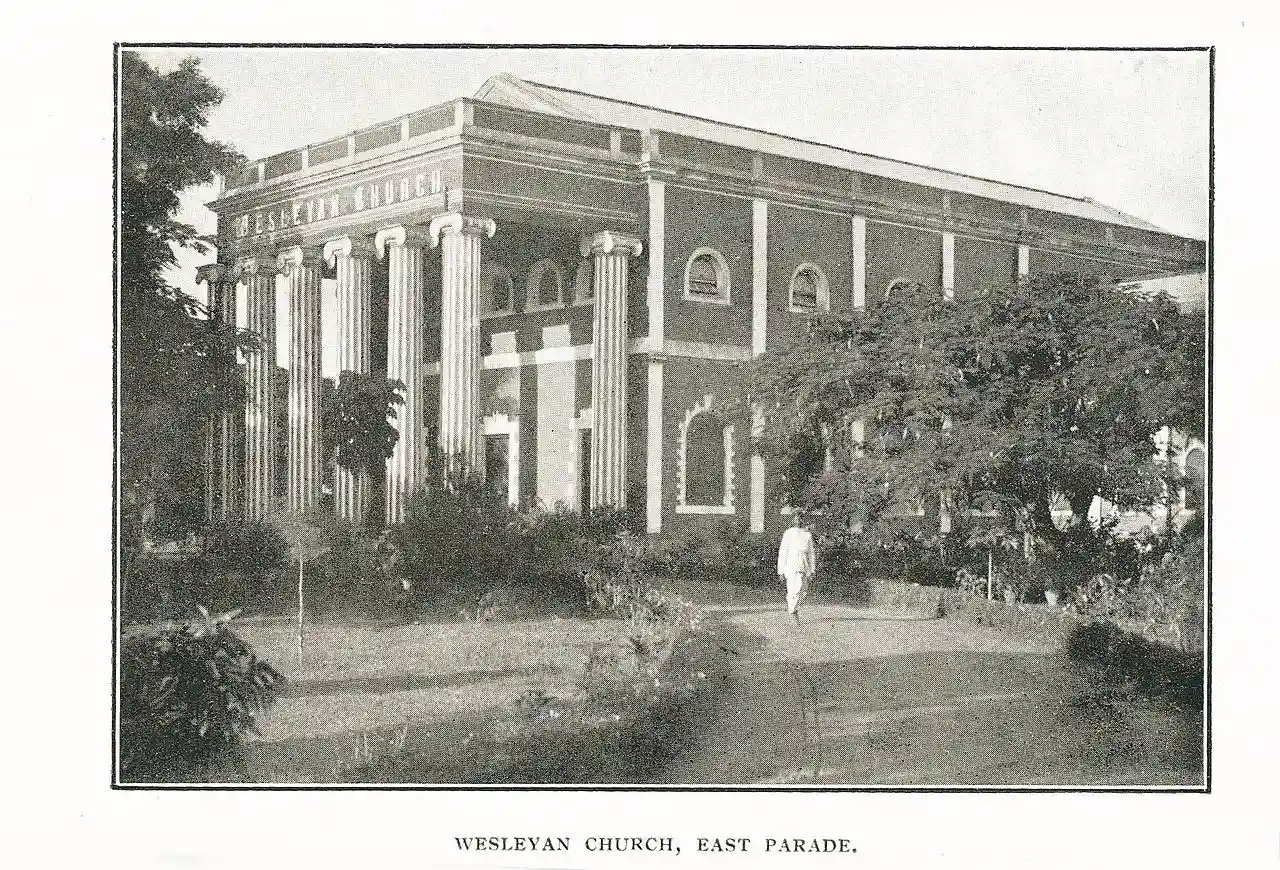The East Parade Church, consecrated in 1865, is located on Mahatma Gandhi Road, in the Bangalore Cantonment. The church comes under the Karnataka Central Diocese of the Church of South India. Started in the early 19th century as the Wesleyan Mission Chapel by Wesleyan believers of the Madras Army with Tamil and English services, the Church now has services in Tamil and Malayalam. The name East Parade comes from its location on the East of the Parade Grounds of the Madras Engineer Group (MEG) regiment. The present church building was raised in 1865, on the site of the old Wesleyan Mission Chapel, with an inscription dated 6 October 1863 marking the laying of the foundation stone. Read more on Wikipedia
