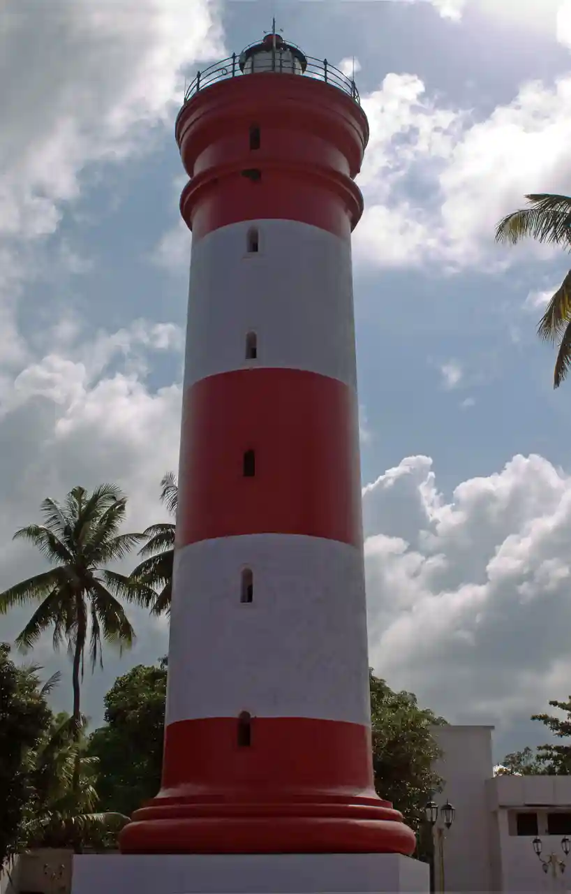 The Alappuzha Lighthouse (or Alleppey Light) is situated in the coastal town of Alappuzha, Kerala. It was built in 1862 and is a major tourist attraction. Visitors are allowed between 1500 hours and 1630 hours on every weekday at an admission fee of 20 rupees for Indian citizens and 50 rupees for foreigners. This is the first of its kind in the Arabian sea coast of Kerala. Read more on Wikipedia