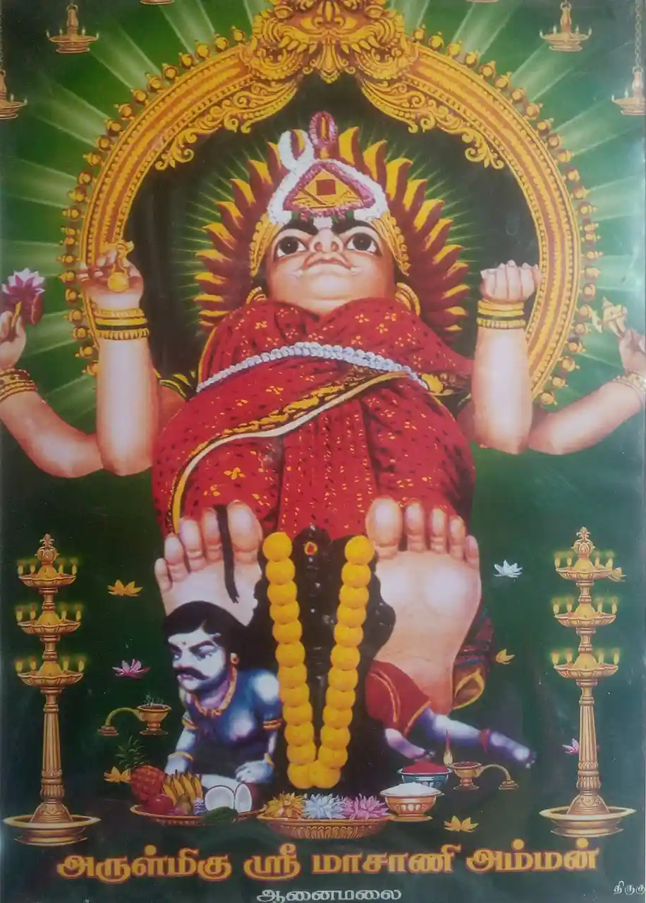 Masani Amman is a Hindu deity. She is primarily worshipped as a clan deity by certain classes in Tamil Nadu, where she is regarded as an avatar (manifestation) of Mahadevi. Her temple is located in Anaimalai, Pollachi, Coimbatore district of Tamil Nadu state, India. Read more on Wikipedia