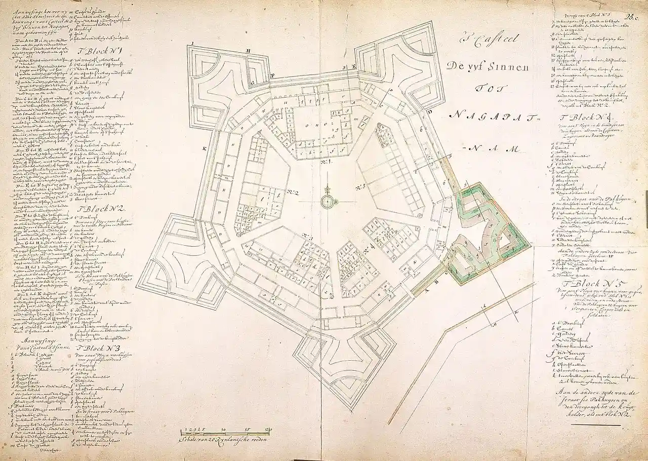 Fort Vijf Sinnen (also Vyf Sinnen, Dutch for "the five senses") was a fortification made by the Dutch East India Company in Nagapattinam, then part of Dutch Coromandel (1610-1798), now Tamil Nadu. The fortification, also described as a castle, was built to protect the interests of the trading company, which shifted the capital of the Coromandel operation from Pulicat to Nagapattinam in 1690, three years after work began on the fort. Read more on Wikipedia