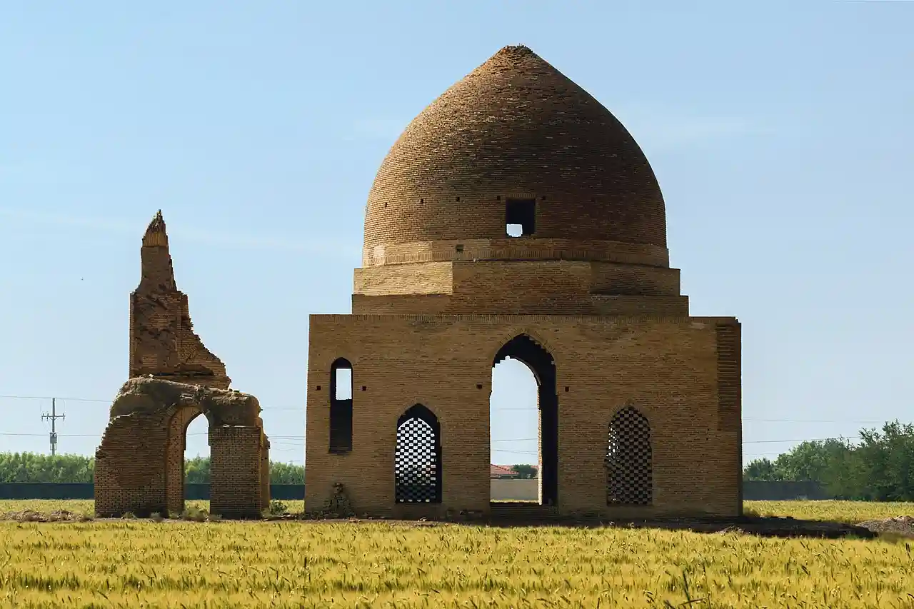 The Kaj Mosque () is a historical mosque located in the Isfahan province of Iran, situated 24 km east of Isfahan on the northern bank of Zayandeh Rud. Currently, only some half-ruined walls and a dome remains from the mosque's original structure. It dates back to the Ilkhanid era. Brick is the most important construction material used for this structure. Even the inner decorations are made of bricks. The mosque had probably a minaret in the past, but there is no trace of it now. Read more on Wikipedia