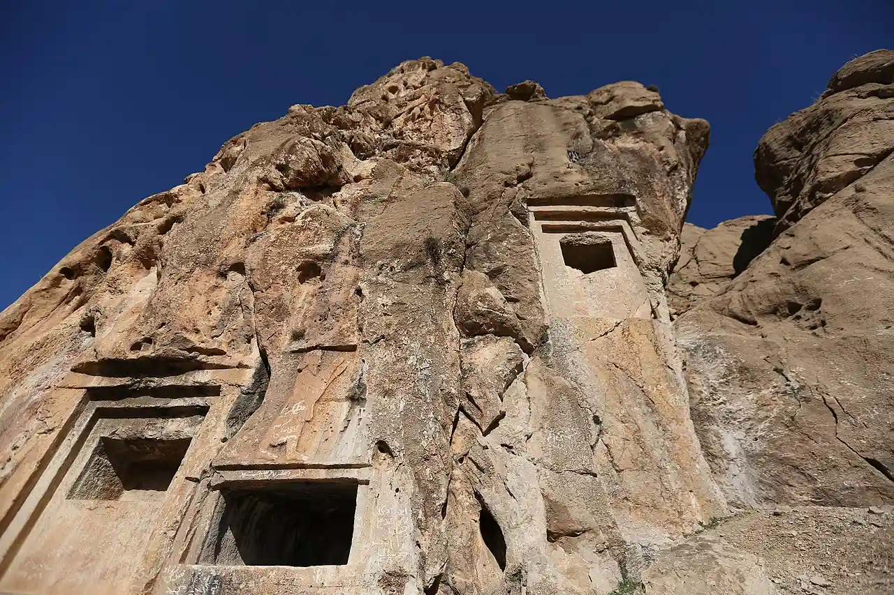 The Essaqwand Rock Tombs () are three rock-hewn tombs located 25 km southwest of Harsin in Kermanshah Province, Iran. On top of the middle tomb there is a rock relief of a man with his profile toward the viewers. He is holding his hands in prayers in front of him. There is also a torch and a fire altar in front of him. Behind the fire altar there is another man, holding up something in his hands. The tombs have been attributed to different historical eras including Medes, Achaemenids, Seleucids and Parthians. Read more on Wikipedia