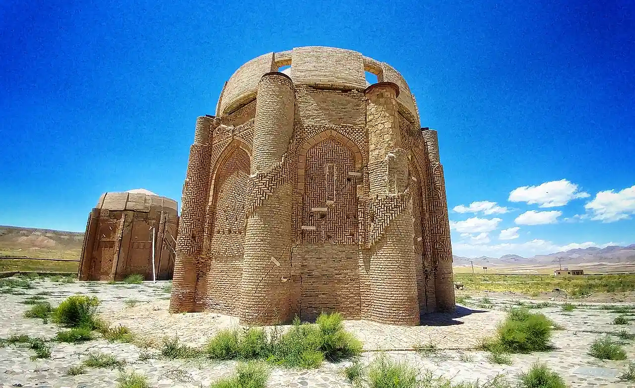 The Kharraqan towers (as known as the Kharrakhan or Kharaghan towers; ) are a pair of mausolea built in 1067 and 1093, in the Kharraqan region of northern Iran, near Qazvin. They are notable for being an early example of geometric ornament, an early example of double domes, and one of the earlier tomb towers that appeared in the Seljuk period of medieval Iran during the 11th century. Read more on Wikipedia