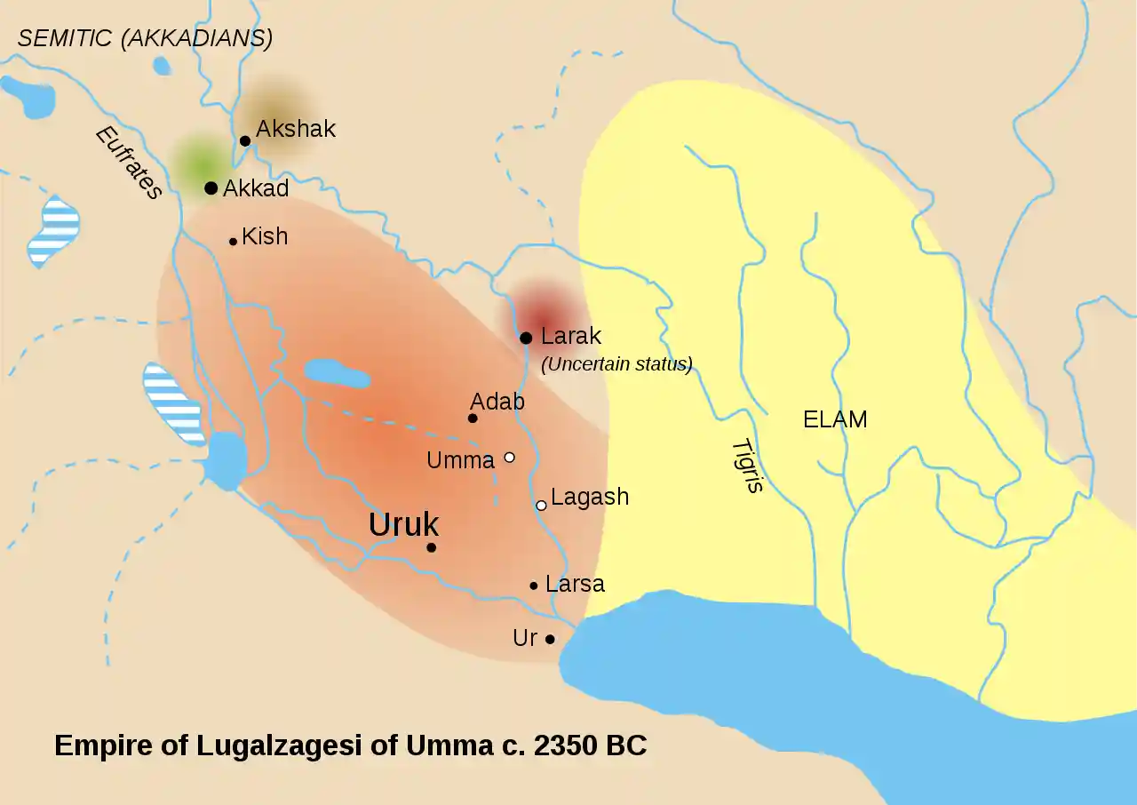 Ur (; Sumerian: , , or Urim; Uru; ; ) was an important Sumerian city-state in ancient Mesopotamia, located at the site of modern Tell el-Muqayyar () in south Iraq's Dhi Qar Governorate.Tell el-Muqayyar: in Arabic Tell means 'mound' or 'hill' and Muqayyar means 'built of bitumen'. Muqayyar is variously transcribed as Mugheir, Mughair, Moghair, etc. Although Ur was once a coastal city near the mouth of the Euphrates on the Persian Gulf, the coastline has shifted and the city is now well inland, on the south bank of the Euphrates, from Nasiriyah in modern-day Iraq. The city dates from the Ubaid period circa 3800 BC, and is recorded in written history as a city-state from the 26th century BC, its first recorded king being King Tuttues. Read more on Wikipedia