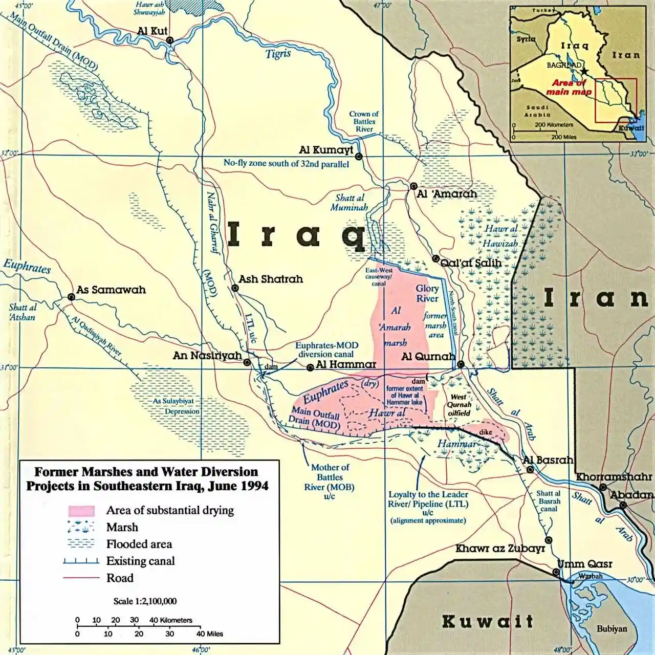 The Hawizeh Marshes are a complex of marshes that straddle the Iran–Iraq border. The marshes are fed by two branches of the Tigris River (the Al-Musharrah and Al-Kahla) in Iraq and the Karkheh River in Iran. The Hawizeh marsh is critical to the survival of the Central and Hammar marshes also make up the Mesopotamian Marshes, because they are a refuge for species that may recolonize or reproduce in other marshlands. Hawizeh Marshes are drained by the Al-Kassarah. This river plays a critical role in maintaining the marshes as a flow-through system and preventing it from becoming a closed saline basin. Read more on Wikipedia