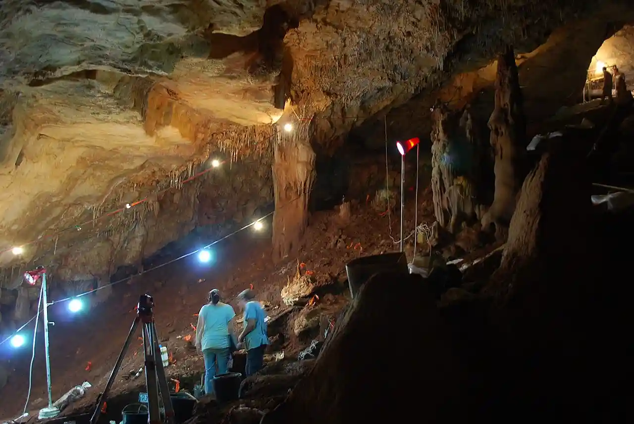 Manot Cave ( Me'arat Manot) is a cave in Western Galilee, Israel, discovered in 2008. It is notable for the discovery of a skull that belongs to a modern human, called Manot 1, which is estimated to be 54,700 years old (U–Th dating of the calcitic crust on the Manot 1 calvaria and of speleothems in the cave). The partial skull was discovered at the beginning of the cave's exploration in 2008. Its significance was realised after detailed scientific analysis, and was first published in an online edition of Nature on 28 January 2015. This age implies that the specimen is the oldest known human outside Africa, and is evidence that modern humans lived side-by-side with Neanderthals. The cave is also noted for its "impressive archaeological record of flint and bone artefacts". Geologically, it is an "active stalactite cave". Read more on Wikipedia